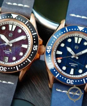 Eine Taucheruhr-Uhr mit einem vielseitigen 39mm Gehäuse, das an fast jedes Handgelenk passt, gefertigt aus Bronze mit einem Zifferblatt in blau und einer besonderen "textured (wood-grain / variegated)"-Oberfläche.