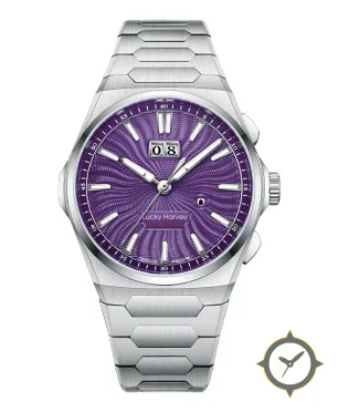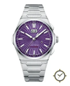Eine Luxus-Uhr mit einem markanten 44.5mm Auftritt am Handgelenk, gefertigt aus Edelstahl mit einem Zifferblatt in lila und einer besonderen "guilloche"-Oberfläche.