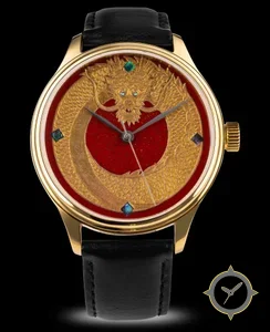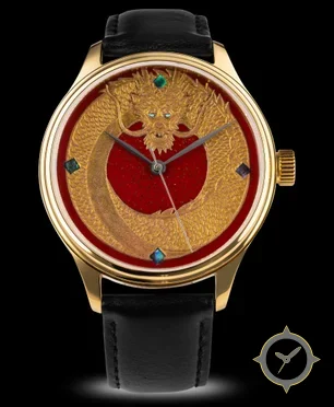 Eine Luxus-Uhr mit einem markanten 49.5mm Auftritt am Handgelenk, gefertigt aus Gold mit einem Zifferblatt in rot und einer besonderen "engraved relief / raised guilloche with applied decoration"-Oberfläche.