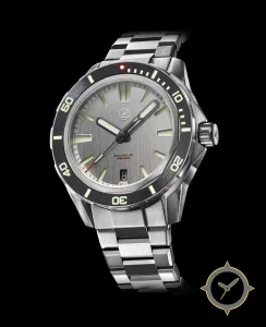 Eine Taucheruhr-Uhr mit einem markanten 46mm Auftritt am Handgelenk, gefertigt aus Edelstahl mit einem Zifferblatt in grau und einer besonderen "vertical brushed"-Oberfläche.