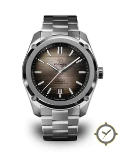 Eine Luxus-Uhr mit einem markanten 45.5mm Auftritt am Handgelenk, gefertigt aus Edelstahl mit einem Zifferblatt in braun und einer besonderen "horizontal brushed gradient"-Oberfläche.