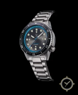 Eine Taucheruhr-Uhr mit einem markanten 49mm Auftritt am Handgelenk, gefertigt aus Edelstahl mit einem Zifferblatt in grau und einer besonderen "sunburst / radial guilloché"-Oberfläche.