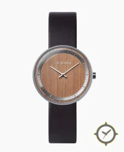 Eine Minimalistisch-Uhr mit einem 35.5mm Gehäuse im Vintage-Stil gefertigt aus Edelstahl mit einem Zifferblatt in braun und einer besonderen "wood-grain"-Oberfläche.
