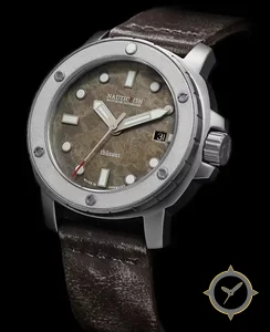 Eine Taucheruhr-Uhr mit einem vielseitigen 40.5mm Gehäuse, das an fast jedes Handgelenk passt, gefertigt aus Edelstahl mit einem Zifferblatt in braun und einer besonderen "aged, mottled patina"-Oberfläche.