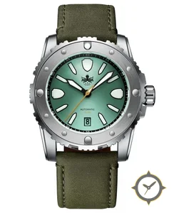 Eine Taucheruhr-Uhr mit einem 36.5mm Gehäuse im Vintage-Stil gefertigt aus Edelstahl mit einem Zifferblatt in türkis und einer besonderen "sunburst"-Oberfläche.