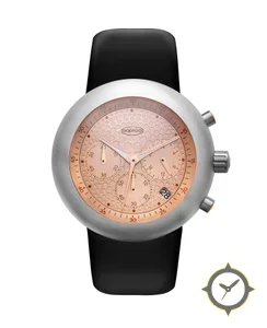 Eine Chronograph-Uhr mit einem 37mm Gehäuse im Vintage-Stil gefertigt aus Edelstahl mit einem Zifferblatt in gold und einer besonderen "raised circular hobnail / dotted texture"-Oberfläche.