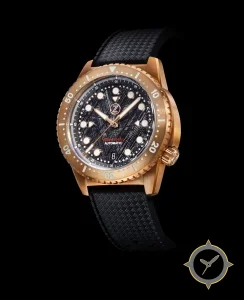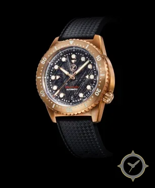 Eine Taucheruhr-Uhr mit einem vielseitigen 40.5mm Gehäuse, das an fast jedes Handgelenk passt, gefertigt aus Bronze mit einem Zifferblatt in schwarz und einer besonderen "meteorite-like textured / cross-hatched surface"-Oberfläche.