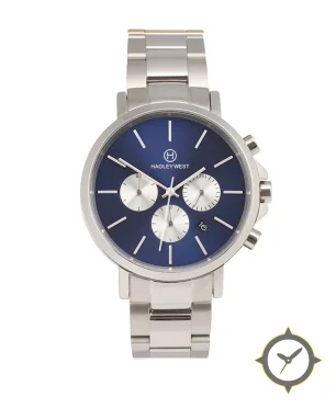 Eine Chronograph-Uhr mit einem vielseitigen 39mm Gehäuse, das an fast jedes Handgelenk passt, gefertigt aus Edelstahl mit einem Zifferblatt in blau und einer besonderen "sunburst/metallic"-Oberfläche.