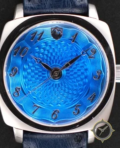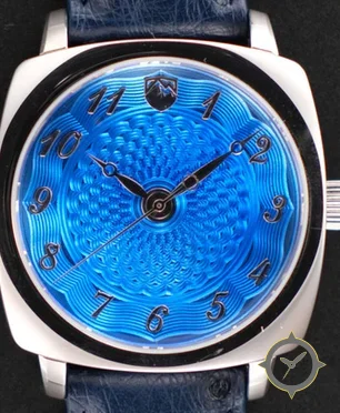Eine Dress-Uhr mit einem 32mm Gehäuse im Vintage-Stil gefertigt aus Edelstahl mit einem Zifferblatt in blau und einer besonderen "guilloché"-Oberfläche.