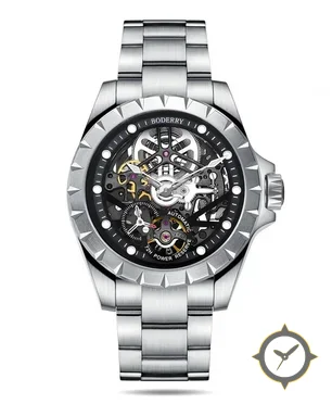 Eine Skelett-Uhr mit einem markanten 48mm Auftritt am Handgelenk, gefertigt aus Edelstahl mit einem Zifferblatt in schwarz und einer besonderen "open-worked / skeleton"-Oberfläche und einer praktischen Gangreserveanzeige.