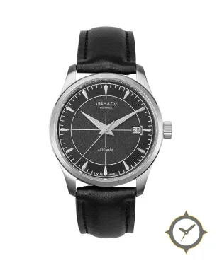 Eine Dress-Uhr mit einem 34mm Gehäuse im Vintage-Stil gefertigt aus Edelstahl mit einem Zifferblatt in schwarz und einer besonderen "grained (textured center)"-Oberfläche.