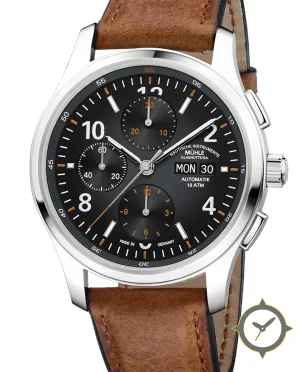 Eine Chronograph-Uhr mit einem vielseitigen 41mm Gehäuse, das an fast jedes Handgelenk passt, gefertigt aus Edelstahl mit einem Zifferblatt in schwarz und einer besonderen "matte with subtle sunburst finish on subdials"-Oberfläche.