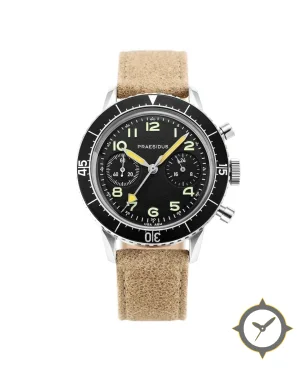 Eine Chronograph-Uhr mit einem 34mm Gehäuse im Vintage-Stil gefertigt aus Edelstahl mit einem Zifferblatt in schwarz und einer besonderen "matte, slightly grained"-Oberfläche.