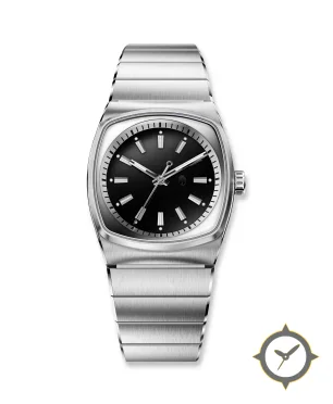 Eine Sport-Uhr mit einem 28mm Gehäuse im Vintage-Stil gefertigt aus Edelstahl mit einem Zifferblatt in schwarz und einer besonderen "matte"-Oberfläche.
