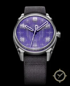 Eine Minimalistisch-Uhr mit einem 37mm Gehäuse im Vintage-Stil gefertigt aus Edelstahl mit einem Zifferblatt in lila und einer besonderen "raised dotted texture"-Oberfläche.