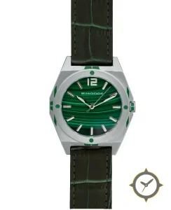 Eine Luxus-Uhr mit einem 36mm Gehäuse im Vintage-Stil gefertigt aus Edelstahl mit einem Zifferblatt in grün und einer besonderen "malachite-style striated texture"-Oberfläche.