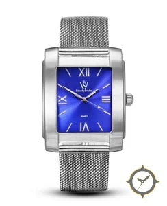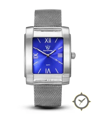 Eine Dress-Uhr mit einem 31.5mm Gehäuse im Vintage-Stil gefertigt aus Edelstahl mit einem Zifferblatt in blau und einer besonderen "sunburst"-Oberfläche.