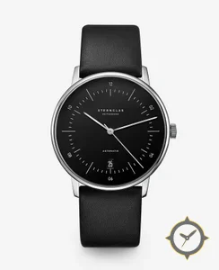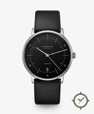Eine Minimalistisch-Uhr mit einem vielseitigen 39.5mm Gehäuse, das an fast jedes Handgelenk passt, gefertigt aus Edelstahl mit einem Zifferblatt in schwarz und einer besonderen "matte"-Oberfläche.