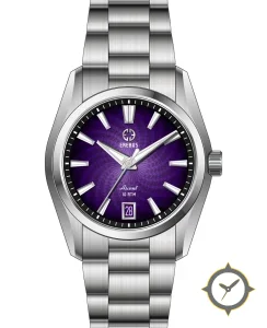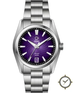 Eine Dress-Uhr mit einem 29.5mm Gehäuse im Vintage-Stil gefertigt aus Edelstahl mit einem Zifferblatt in lila und einer besonderen "guilloche spiral / subtle sunburst"-Oberfläche.
