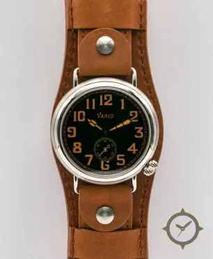 Eine Pilot-Uhr mit einem 32.5mm Gehäuse im Vintage-Stil gefertigt aus Edelstahl mit einem Zifferblatt in schwarz und einer besonderen "matte"-Oberfläche.