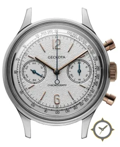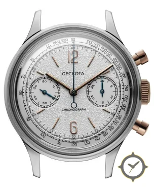 Eine Chronograph-Uhr mit einem markanten 46mm Auftritt am Handgelenk, gefertigt aus Edelstahl mit einem Zifferblatt in weiß und einer besonderen "granular / frosted (snowflake) texture"-Oberfläche.