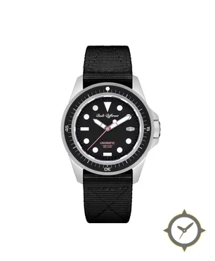 Eine Taucheruhr-Uhr mit einem 34.5mm Gehäuse im Vintage-Stil gefertigt aus Edelstahl mit einem Zifferblatt in schwarz und einer besonderen "matte"-Oberfläche.