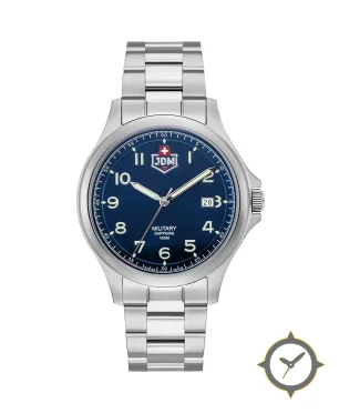 Eine Militär-Uhr mit einem markanten 46.5mm Auftritt am Handgelenk, gefertigt aus Edelstahl mit einem Zifferblatt in blau und einer besonderen "sunburst"-Oberfläche.
