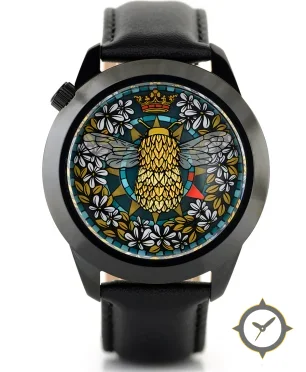Eine Dress-Uhr mit einem 34mm Gehäuse im Vintage-Stil gefertigt aus Edelstahl mit einem Zifferblatt in türkis und einer besonderen "enamel-style painted illustration"-Oberfläche.