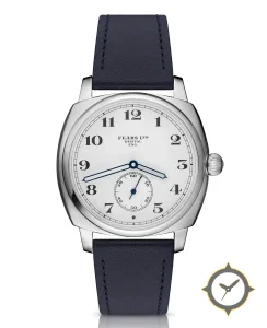Eine Dress-Uhr mit einem markanten 41.5mm Auftritt am Handgelenk, gefertigt aus Edelstahl mit einem Zifferblatt in weiß und einer besonderen "enamel"-Oberfläche.