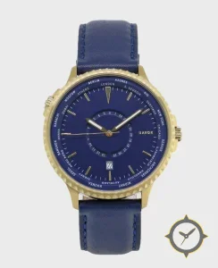 Eine Weltzeituhr-Uhr mit einem 36mm Gehäuse im Vintage-Stil gefertigt aus Gold mit einem Zifferblatt in blau und einer besonderen "matte"-Oberfläche, ideal für Weltenbummler dank der Weltzeit-Funktion.