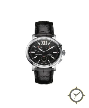 Eine Chronograph-Uhr mit einem vielseitigen 38.5mm Gehäuse, das an fast jedes Handgelenk passt, gefertigt aus Edelstahl mit einem Zifferblatt in schwarz und einer besonderen "matte"-Oberfläche.