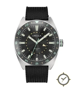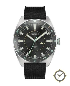 Eine GMT-Uhr mit einem markanten 41.5mm Auftritt am Handgelenk, gefertigt aus Edelstahl mit einem Zifferblatt in schwarz und einer besonderen "sunburst"-Oberfläche und einer echten GMT-Funktion, mit der du eine zweite Zeitzone verfolgen kannst.