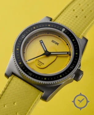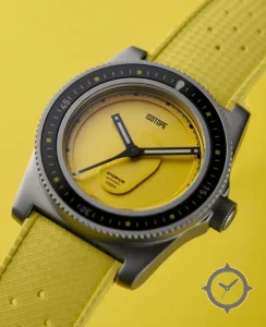 Eine Taucheruhr-Uhr mit einem vielseitigen 38mm Gehäuse, das an fast jedes Handgelenk passt, gefertigt aus Edelstahl mit einem Zifferblatt in gelb und einer besonderen "matte"-Oberfläche.