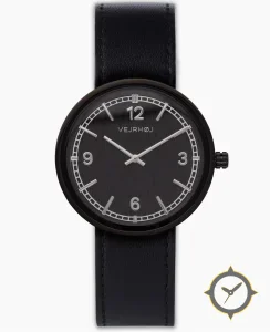 Eine Minimalistisch-Uhr mit einem markanten 48mm Auftritt am Handgelenk, gefertigt aus Edelstahl mit einem Zifferblatt in schwarz und einer besonderen "wood-grain"-Oberfläche.