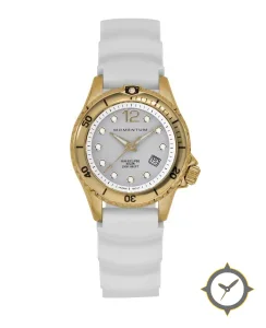 Eine Taucheruhr-Uhr mit einem 29.5mm Gehäuse im Vintage-Stil gefertigt aus Gold mit einem Zifferblatt in weiß und einer besonderen "smooth"-Oberfläche.