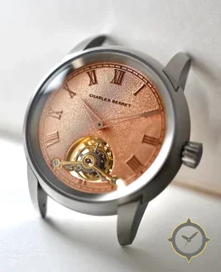 Eine Dress-Uhr mit einem markanten 45mm Auftritt am Handgelenk, gefertigt aus Edelstahl mit einem Zifferblatt in gold und einer besonderen "frosted / grained (sandblasted) finish"-Oberfläche.
