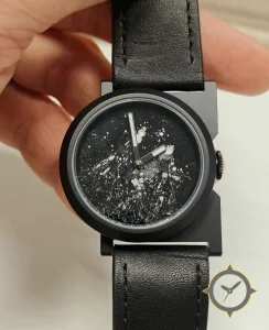 Eine Minimalistisch-Uhr mit einem 26.5mm Gehäuse im Vintage-Stil gefertigt aus Edelstahl mit einem Zifferblatt in schwarz und einer besonderen "speckled/splatter"-Oberfläche.