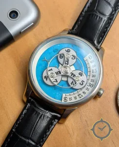 Eine Skelett-Uhr mit einem 35mm Gehäuse im Vintage-Stil gefertigt aus Edelstahl mit einem Zifferblatt in türkis und einer besonderen "marbled / natural stone texture (turquoise-like)"-Oberfläche.