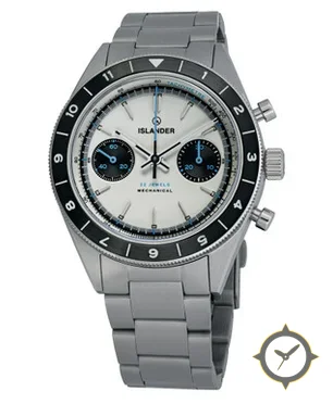 Eine Chronograph-Uhr mit einem 37.5mm Gehäuse im Vintage-Stil gefertigt aus Edelstahl mit einem Zifferblatt in weiß und einer besonderen "smooth/matte"-Oberfläche.
