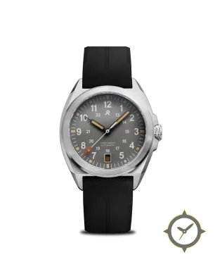 Eine Field-Uhr mit einem markanten 45.5mm Auftritt am Handgelenk, gefertigt aus Edelstahl mit einem Zifferblatt in grau und einer besonderen "matte, slightly grained"-Oberfläche.