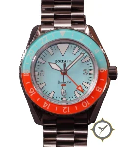 Eine GMT-Uhr mit einem vielseitigen 38mm Gehäuse, das an fast jedes Handgelenk passt, gefertigt aus Edelstahl mit einem Zifferblatt in türkis und einer besonderen "matte"-Oberfläche und einer echten GMT-Funktion, mit der du eine zweite Zeitzone verfolgen kannst.