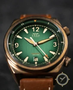 Eine Taucheruhr-Uhr mit einem markanten 45.5mm Auftritt am Handgelenk, gefertigt aus Bronze mit einem Zifferblatt in grün und einer besonderen "sunburst"-Oberfläche.
