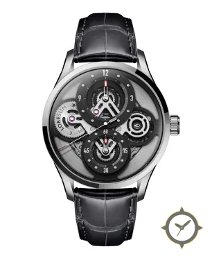 Eine Skelett-Uhr mit einem markanten 47mm Auftritt am Handgelenk, gefertigt aus Edelstahl mit einem Zifferblatt in grau und einer besonderen "brushed, open-worked/skeletonized"-Oberfläche.