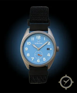 Eine Field-Uhr mit einem vielseitigen 40.5mm Gehäuse, das an fast jedes Handgelenk passt, gefertigt aus Edelstahl mit einem Zifferblatt in blau und einer besonderen "matte"-Oberfläche.