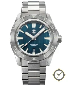 Eine Taucheruhr-Uhr mit einem markanten 49.5mm Auftritt am Handgelenk, gefertigt aus Edelstahl mit einem Zifferblatt in blau und einer besonderen "vertical brushed"-Oberfläche.