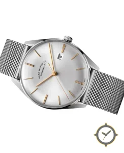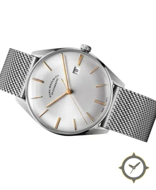 Eine Dress-Uhr mit einem markanten 45mm Auftritt am Handgelenk, gefertigt aus Edelstahl mit einem Zifferblatt in silber und einer besonderen "sunburst"-Oberfläche.