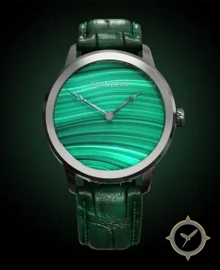 Eine Minimalistisch-Uhr mit einem 35mm Gehäuse im Vintage-Stil gefertigt aus Edelstahl mit einem Zifferblatt in grün und einer besonderen "malachite stone, polished"-Oberfläche.
