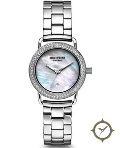 Eine Dress-Uhr mit einem 22.5mm Gehäuse im Vintage-Stil gefertigt aus Edelstahl mit einem Zifferblatt in weiß und einer besonderen "mother-of-pearl"-Oberfläche.