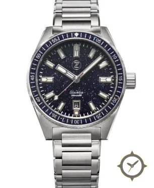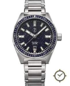 Eine Taucheruhr-Uhr mit einem vielseitigen 41mm Gehäuse, das an fast jedes Handgelenk passt, gefertigt aus Edelstahl mit einem Zifferblatt in marineblau und einer besonderen "sparkling aventurine / starry finish"-Oberfläche.