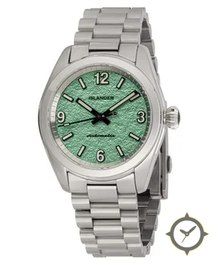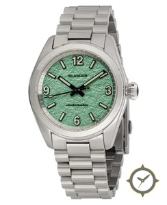 Eine Field-Uhr mit einem vielseitigen 39mm Gehäuse, das an fast jedes Handgelenk passt, gefertigt aus Edelstahl mit einem Zifferblatt in grün und einer besonderen "grained/textured"-Oberfläche.